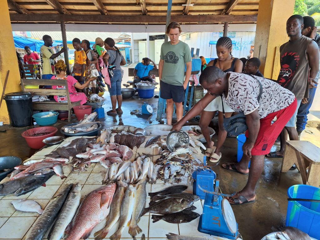Nach dem Eintauchen bei karibischem Flair ging’s bald per Auto in die Kleinstadt Kribi auf den Fischmarkt, um das Abendessen einzukaufen. Im Supermarkt nebenan wurde schließlich auch sie flüssige Versorgung sichergestellt. Denn das ist neben Fußball die nächste Konstante in Kamerun: Alkohol. Die Einheimischen sind definitiv sehr trinkfreudig. Stellenweise ist es in manchen Shops sogar leichter, an Bier, als an Wasser zu kommen.