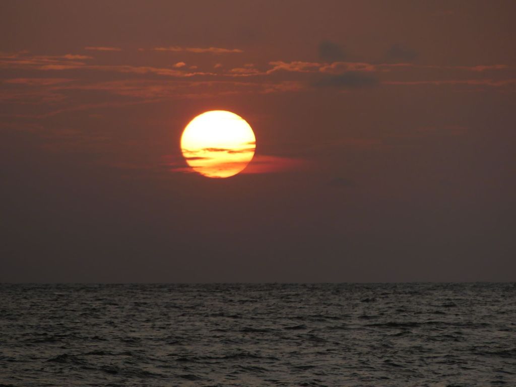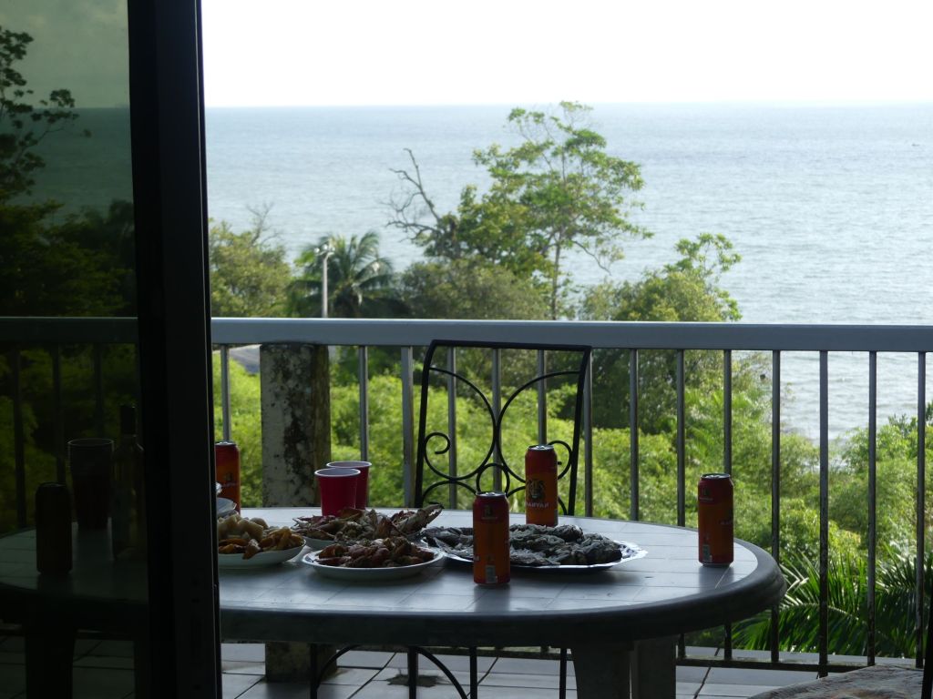 Nach diesem herrlichen Nachmittag in dem Städtchen ging’s zurück zum idyllischen Landhaus, ein köstliches Abendmahl wurde in die Wege geleitet. Mit viel Fisch und auch Bier genossen wir auf dem Balkon den Sonnenuntergang über dem Atlantik. Einzig ein Ölterminal der Tschad-Kamerun-Pipeline am Horizont trübte den idyllischen Eindruck.