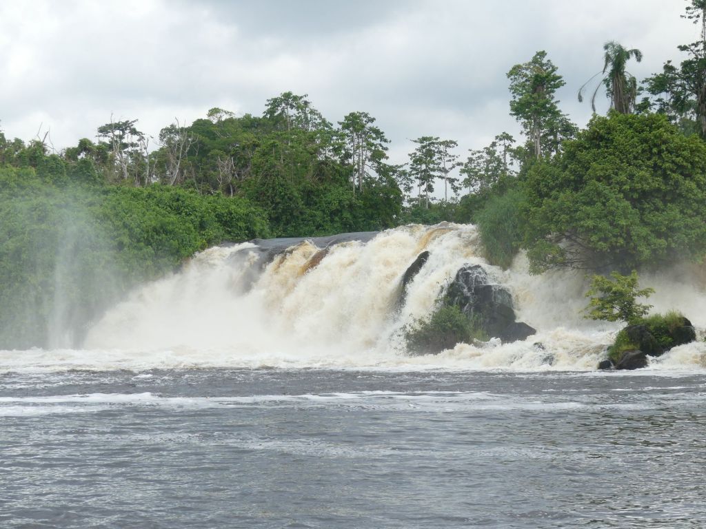 Später war er dann jedoch wach, als es per Auto wieder nach Kribi ging, bzw. durch den Ort hindurch und etwas dahinter zu einem Wasserfall, den Chutes de Lobé, wo der Lobé-Fluss in den Atlantik fließt.