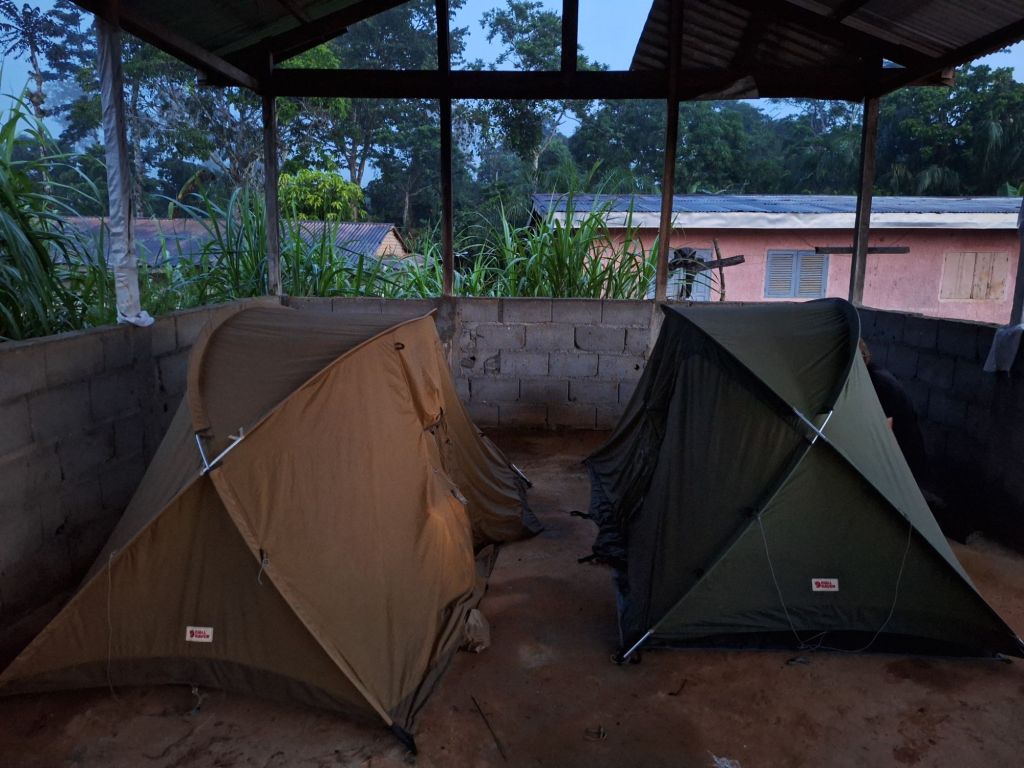 In unserem Fall hat der Dorfchef uns direkt erlaubt, bei ihm in einem Erdgeschossraum die Zelte aufzuschlagen. Regengeschützt standen nun die Zelte in dem Innenraum. Dieser war jedoch sehr offen, weshalb man sich vor herumliegenden Vögel und deren Kot sehr in Acht nehmen musste. Die vergitterten Fenster eigneten sich immerhin perfekt, die nasse Wäsche noch einmal rauszuhängen…