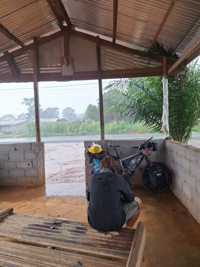 Gottseidank gab es in der kleinen Siedlung einen Unterstand, wo wir Schutz suchten. Das Gewitter kam immer näher, zwei Blitzeinschläge waren hier so nah, dass sie durch Mark und Bein gingen. Es kübelte so heftig, dass ich sogar meine Trinkflasche rausstellen konnte und diese wieder etwas mehr Wasser bekam.