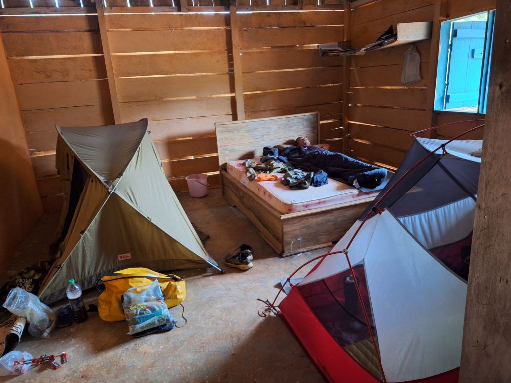 Relativ problemlos durften wir jedoch bleiben, ja, wir durften wiederum sogar im Innenraum seiner Hütte schlafen auf meine ebenso standardmäßige Nachfrage: „Vous avez une place protegée s’il pleut?“ („Habt ihr einen geschützten Platz, falls es regnet?“). Man stellte uns sogar einen Tank Wasser zur Verfügung, damit wir alle eine Eimerdusche genießen konnten, sowie einen Mehrfachstecker für das Aufladen von Powerbanks und Handys – wirklich alles, was wir brauchten!