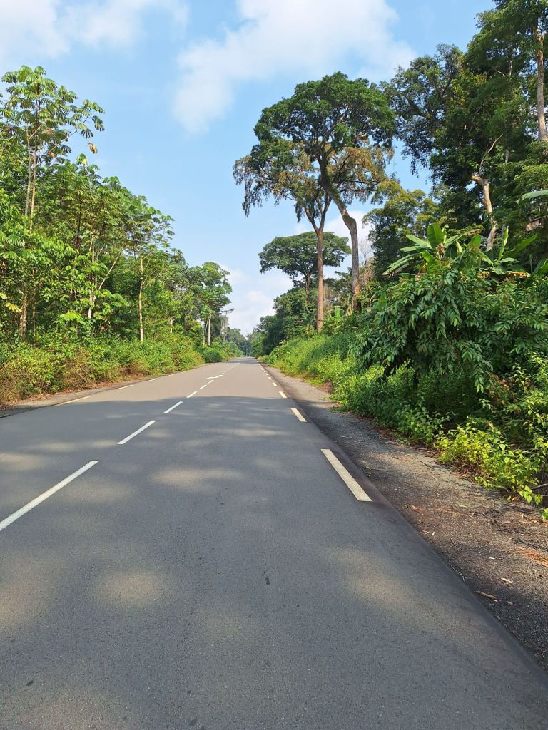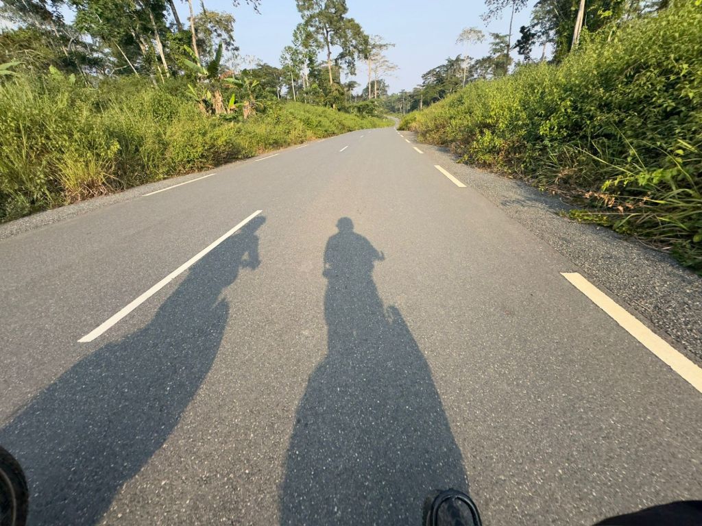 Nach 30 Kilometern machten wir Pause, als Omar eine Ananas am Straßenrand fand und kaufte. Diese wurde an einem schattigen Unterstand verspeist, ehe es weiterging auf die finalen 50 Kilometer am Nachmittag. Die Strecke war wunderschön durch den Dschungel, es lag zudem, ähnlich wie in unserem Herbst, eine leichte Dunstglocke in der Luft, die für ein herrliches Licht und zudem angenehmere Luft sorgte.