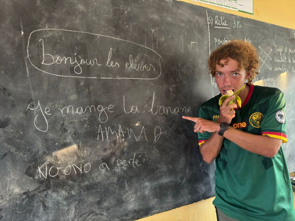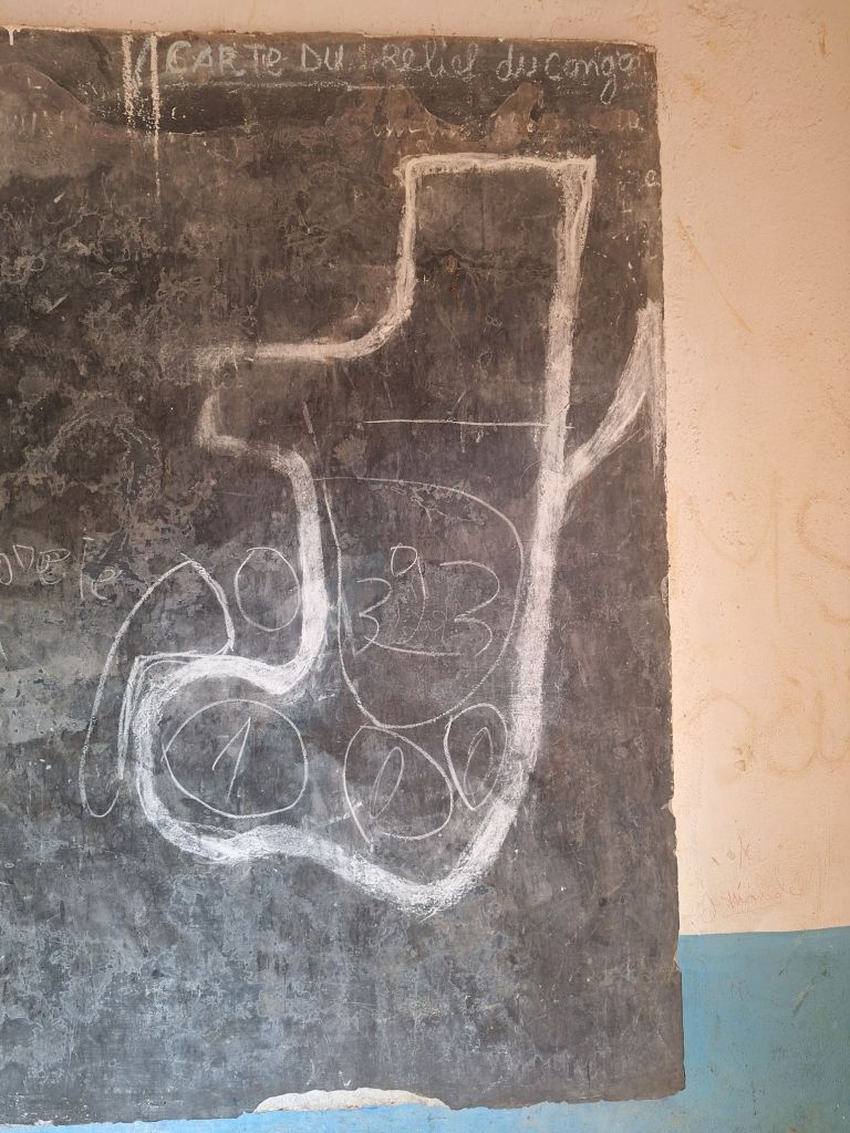 Zudem ist es bei den Übernachtungen in den Schulen immer wieder interessant, den letzten Tafeleintrag zu studieren. Diesmal hatten die Schüler wohl als letztes Geographie-Unterricht. Die Zeichnung des Umrisses der Republik Kongo legt dies zumindest sehr nahe.