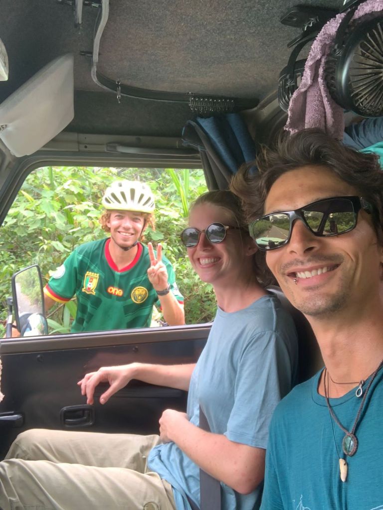 Da ich bereits Haferflocken gefrühstückt habe, war das für mich fast ein bisschen viel. Mit übervollem Magen ging’s um 11 Uhr schließlich sehr spät los. Auf den ersten Kilometern gab’s gleich zwei Zufälle zu berichten. Einerseits unterhielten wir uns in der Früh über andere Reisende, die wir bereits kennengelernt haben. Unter ihnen ein Schweizer Paar, das mit dem Camper auf dem Weg nach Südafrika war. Wir haben sie in Ghana auf einem Campingplatz kennengelernt.