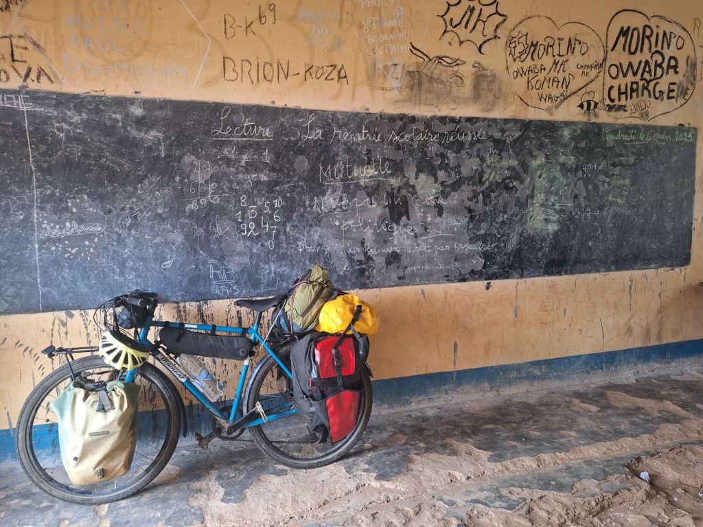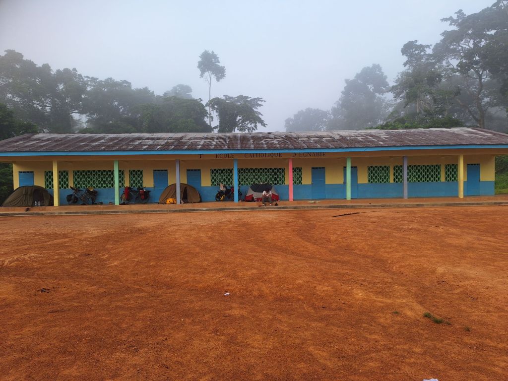 Auch die Hügel wurden nicht weniger, im Gegenteil – es ging ein paar Mal ordentlich zur Sache, ehe wir nach über 85 Kilometern ein Dorf fanden mit einer Schule. Diese Schulen mit ihrem Vordach und der ebenen Betonfläche sind hier mittlerweile eine etablierte Lösung, um die Nacht zu verbringen. Es war 17 Uhr, eine knappe Stunde hätten wir noch fahren können. Doch die Kräfte schwanden, weshalb wir uns wiederum an den Chef du Village wandten. Wiederum ohne Probleme durften wir an dem angepeilten Platz unser Lager aufschlagen.