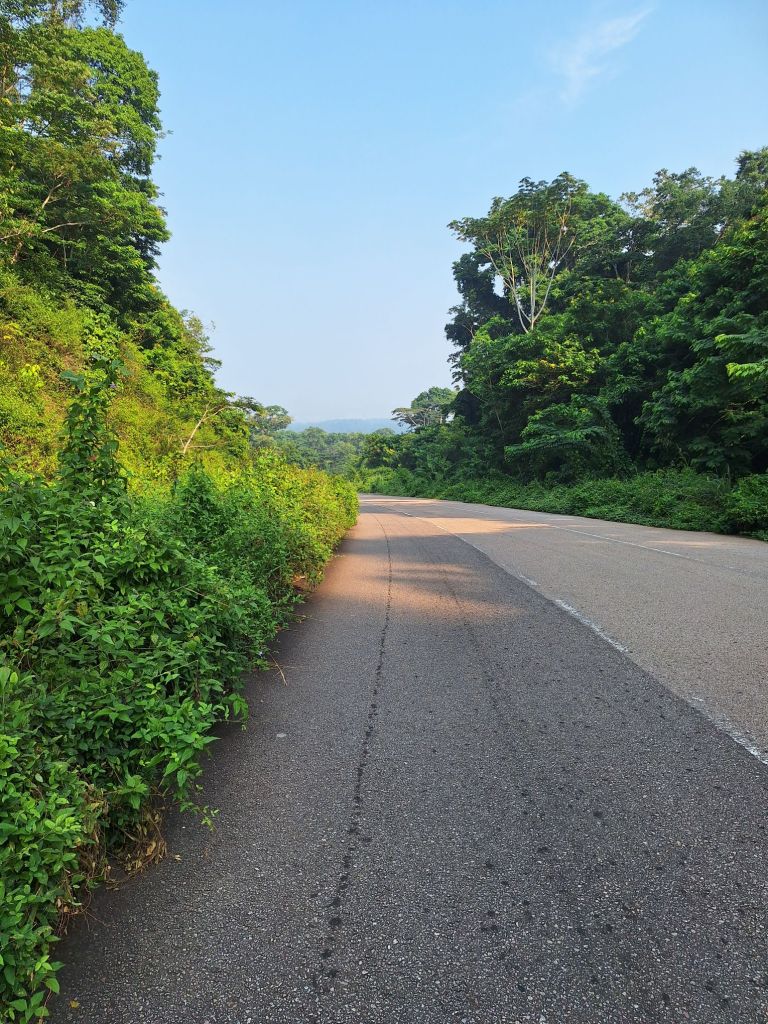 Eine wirkliche Mahlzeit hatten sie hier in dem Ort nicht im Angebot, doch immerhin gab’s kühle Getränke. Hinterher wurden in den paar Läden noch die notwendigen Dinge wie Wasser und Nudeln eingekauft. Im weiteren Verlauf des Ortes nach einem wiederum markanten Hügel fand ich sogar noch Haferflocken – damit war ich erstmal wunschlos glücklich. Anschließend ging es wieder raus aus der Stadt – und damit auch raus aus dem Internetempfang und wiederum rein in die endlose Dschungellandschaft in spärlicher Infrastruktur bei geringer Bevölkerungsdichte.