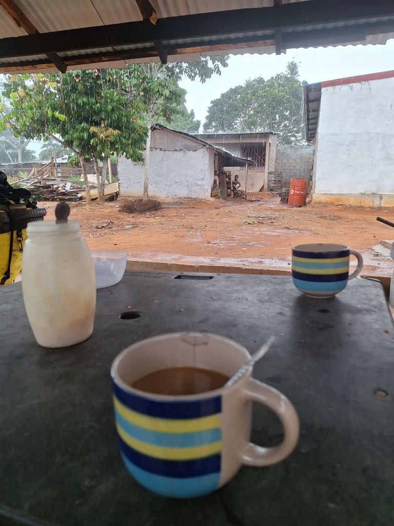 In dem Örtchen Keta gab’s wenigstens wieder das berühmte Omelette, wo wir auf Jannick warteten. Als er eintraf, kam dann noch eine große Unwetterfront auf, weshalb wir in dem kleinen Restaurant mehr Zeit verbrachten. Aber wir hatten ja keinen Stress, schließlich waren es nun nur noch 25 Kilometer bis Ouesso.