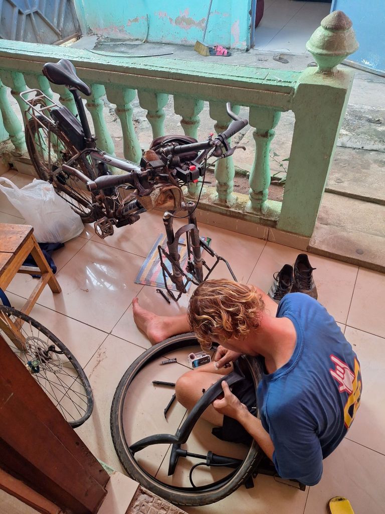 Den Pausentag konnte man zudem kaum als einen solchen bezeichnen, zu viele Dinge waren zu erledigen. Von Wäsche waschen über Reparaturen am Fahrrad. Insbesondere Pechvogel Jannick hatte einen vollen Tag, musste er doch irgendwie schauen, wie er seine Schaltung repariert bekommt. Und als ob das nicht genug wäre, rollte er sein Fahrrad bei der Einfahrt in den Hotel-Innenhof auch noch genau über eine Glasscherbe. Ein lautes Zischen zeigte unmissverständlich: Das ist der nächste platte Reifen. Es steht nun 18:0 für Jannick in Bezug auf platte Reifen…