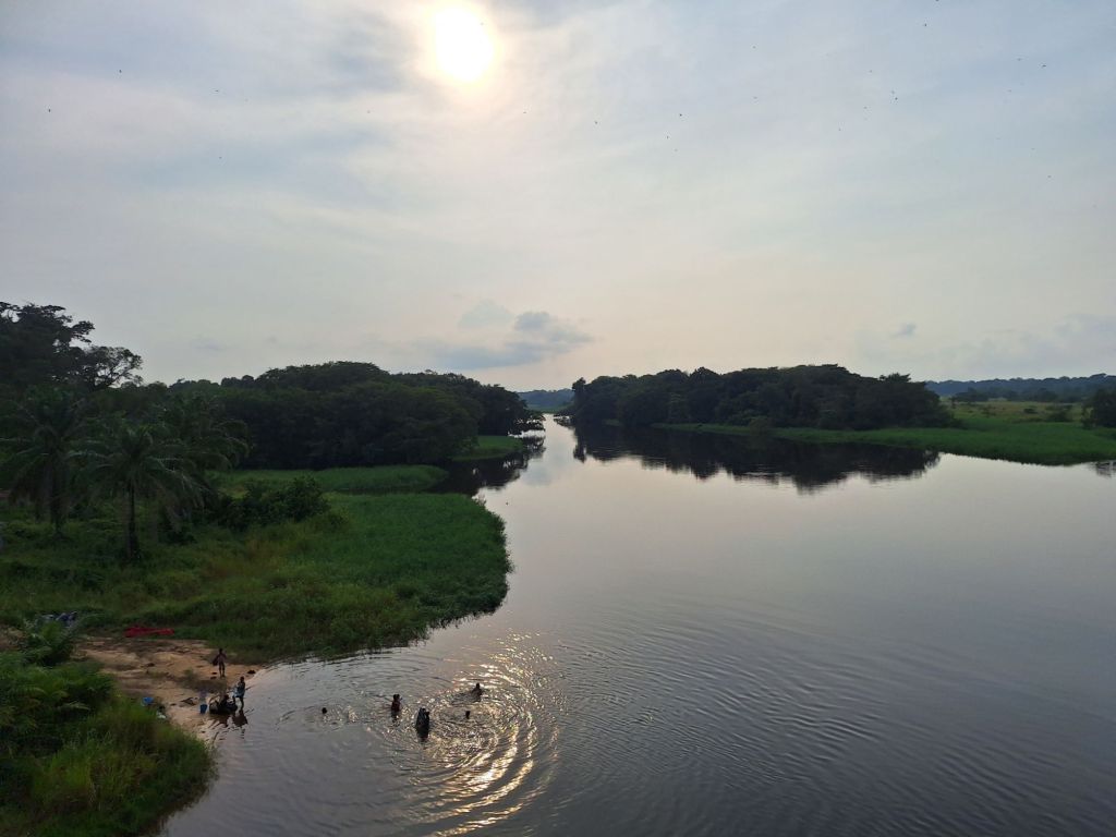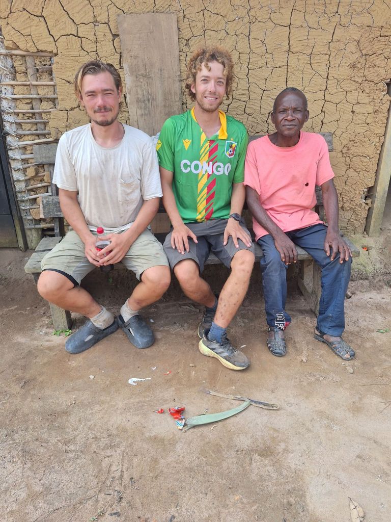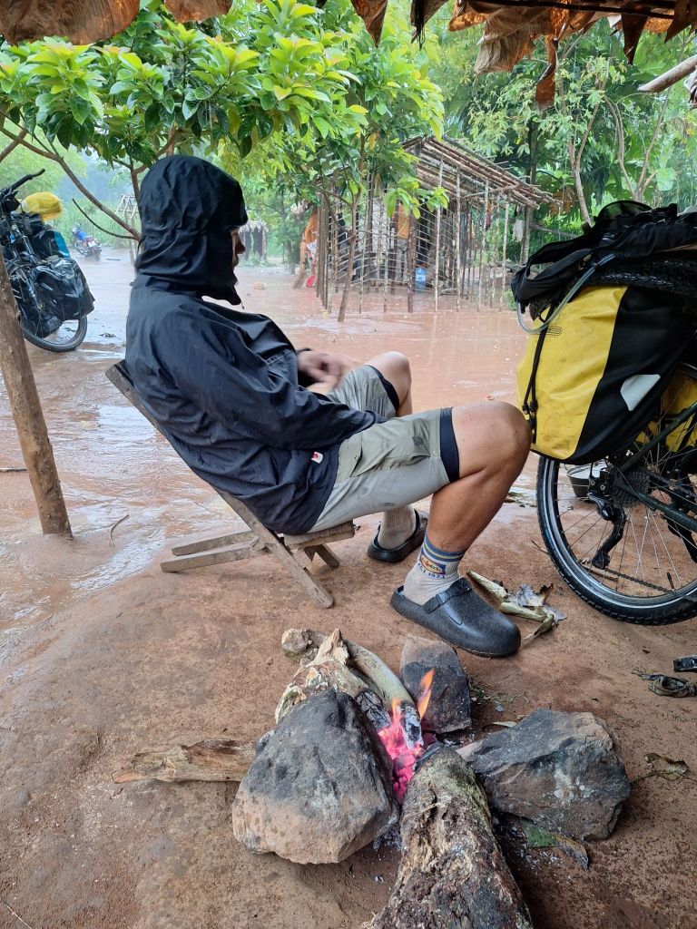 Herzerwärmend war die Fürsorglichkeit der Bewohner, die uns direkt einen Platz unter einem Vordach freimachten und auch unsere Fahrräder gleich mit einer Plane vor dem Starkregen schützten. Zudem machten sie uns ein Feuer, als wir doch leicht auszukühlen drohten in unserer klammen Kleidung bei den Umständen – vielen Dank hierfür! Die Kommunikation erfolgte hierbei mehr oder weniger mit Händen und Füßen sowie etwas Französisch, denn in Kongo hat, wie wir von Einheimischen gelernt haben, quasi jede Siedlung ihre eigene Stammessprache. Wenn man sprachbegeistert ist, kann man hier also viel lernen.