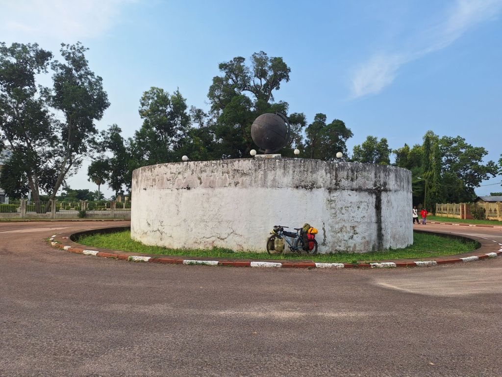 Natürlich brauchten wir in der Lage Zeit, viel Zeit. Hinzu kam eine Polizeikontrolle, die uns zusätzlich Zeit kostete. Immerhin wurde es zum Ende hin tendenziell flacher, zudem motivierte die Aussicht der Überquerung des Äquators, hierfür gab es am Beginn vom Ort Makoua sogar ein eigenes Monument in Form einer Weltkugel.