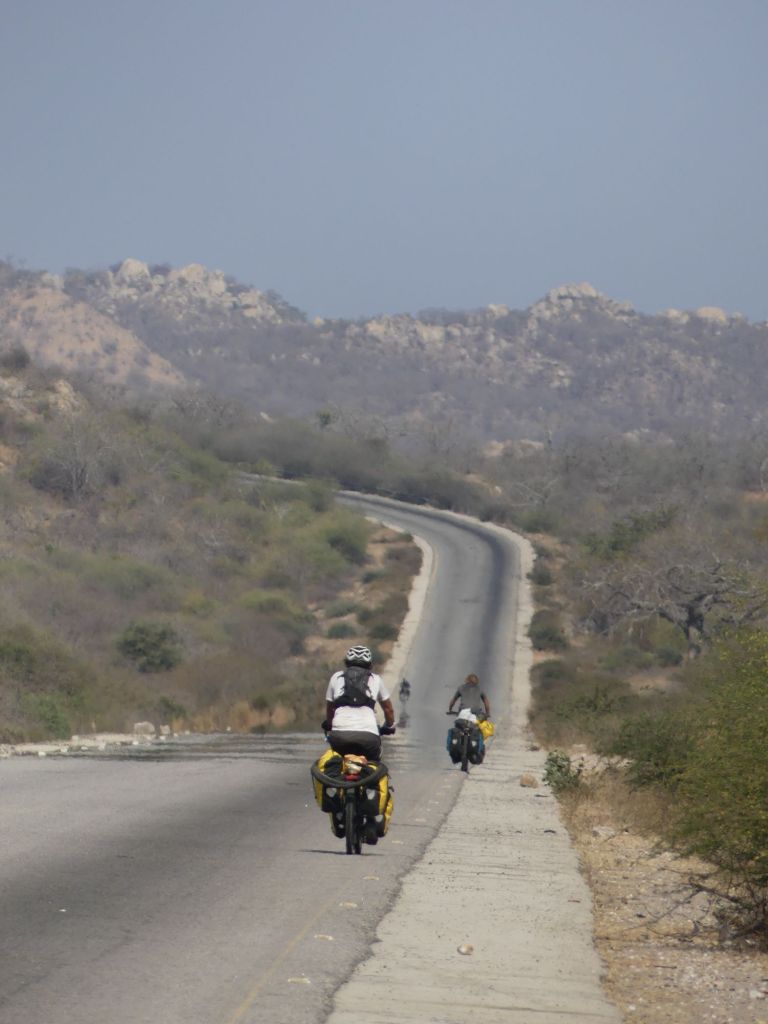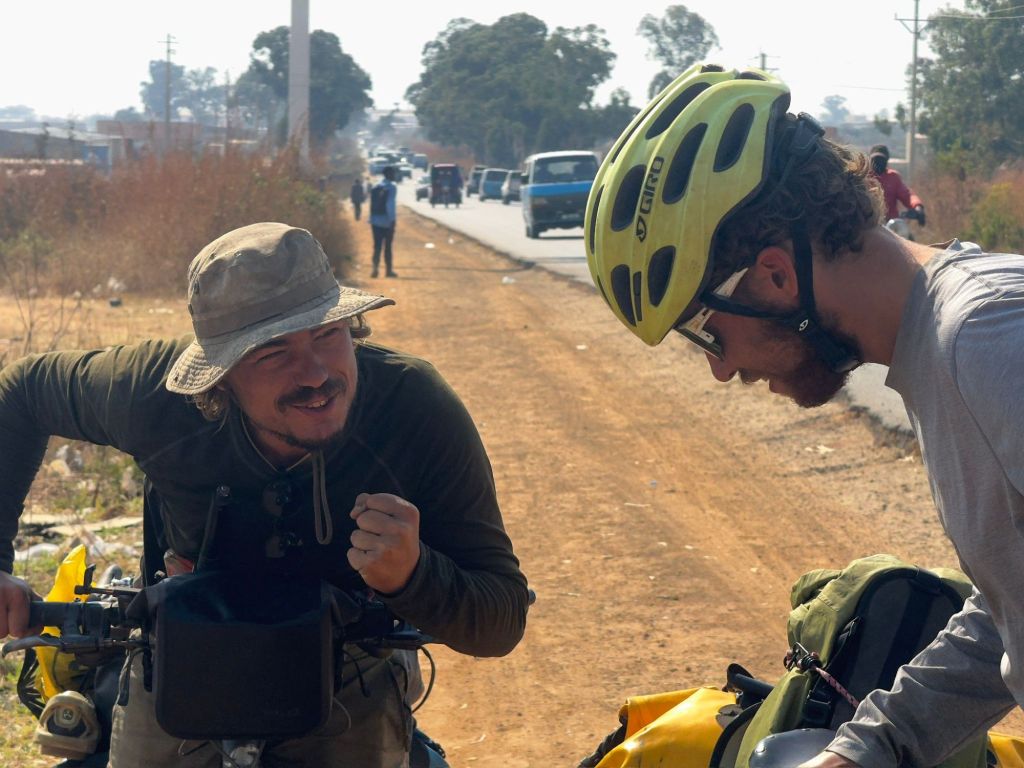 Im nächsten Ort telefonierten wir mit ihm, da die große Standpumpe ja in meinen Taschen schlummerte: Schaffst dus bis hier her? Ist noch genug Luft im Reifen? Sonst bringen wir die Pumpe per Mototaxi von hier vorbei! War aber letztlich nicht notwendig: Die knappen 10 Kilometer konnte sich Jannick auch mit schnell draufgepumpten 2,5 Bar mit seiner Handpumpe durchkämpfen.