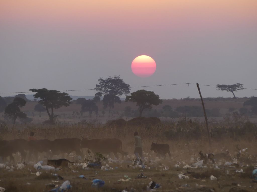 Kurz darauf gab es hinter der Tanke wiederum einen spektakulären Sonnenuntergang zu bestaunen, begleitet vom Eintreiben der Tiere einer Kuhweide und viel Plastikmüll in der Landschaft – Afrika in einem Foto!