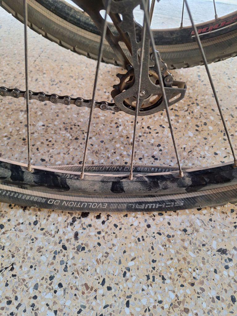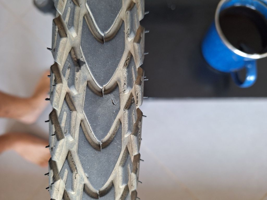 Die Ursache war schnell gefunden: Ein sauberer Cut im Mantel, wahrscheinlich verursacht durch eine Glasscherbe. Ich nahm den Mantel von der Felge – ja, genau darunter war auch das Loch. Ich überlegte kurz, doch entschied ich mich relativ bald für einen Wechsel. Dieser Schlauch hat mich über 16.000 Kilometer begleitet und zuverlässige Dienste geleistet. Angesichts des Überangebotes an Ersatzschläuchen in meinem Gepäck erlöste ich meinen treuen Begleiter. Hoffentlich handelte es sich hier um einen kurzen Spuk! Mantel wieder auf die Felge und der Eingriff war erledigt.