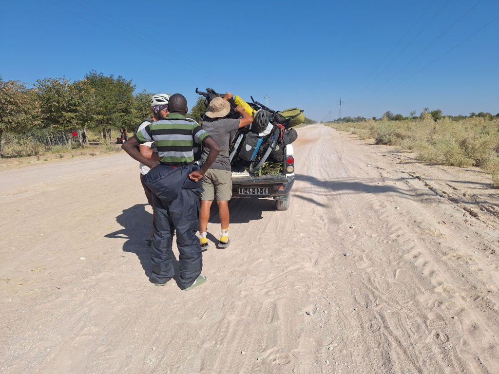 Wahnsinn! Was haben wir nur für ein Glück im Unglück! Jetzt nur noch schnell die Räder irgendwie tetrismäßig auf die viel zu kleine Ladefläche bringen. Mit einigem Quetschen und etwas Improvisation in Form von Spanngurten schien alles geregelt. „But I don’t go directly. I have to bring and pick up some other people“, dämpfte der Fahrer etwas unsere Euphorie: „It could become late…“