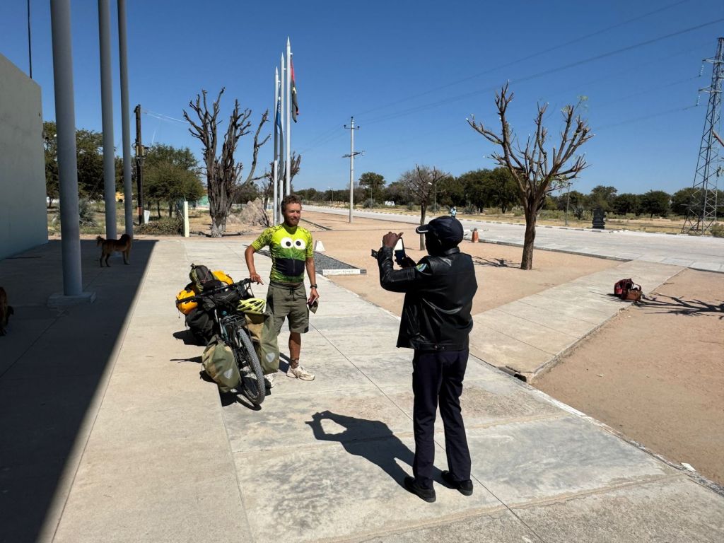 Nach allen den Feierlichkeiten an diesem besonderen Tag ging es schließlich zur Grenze, erstmal mussten wir uns den Ausreisestempel aus Angola holen. Wie bereits bei der Einreise, wurden hier nochmals unsere Fortbewegungsmittel dokumentiert, wir standen für Ablichtungen mit unserem Zweirad bereit.