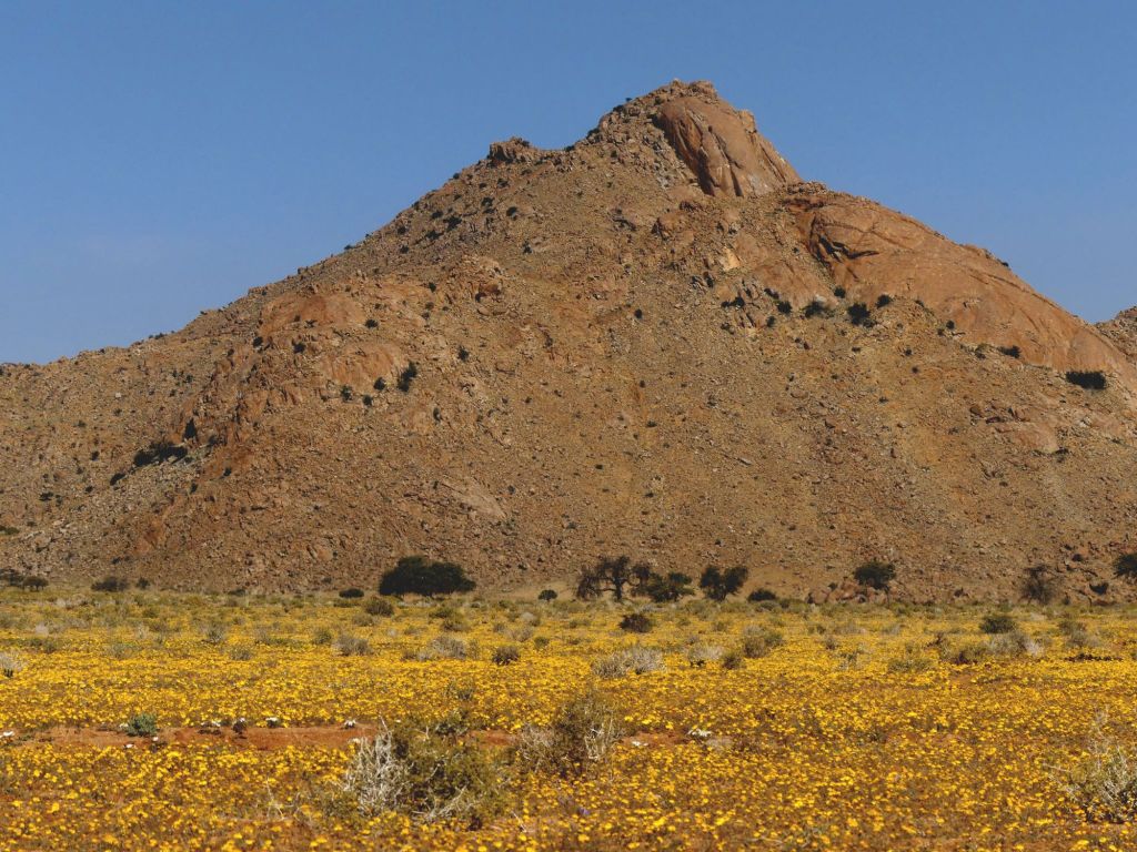 Hier war Südafrika nicht mehr weit und die Landschaft änderte sich wiedermal abrupt. Aus Wüste wurde nun blühende Landschaft bei majestätischen Berggestalten.