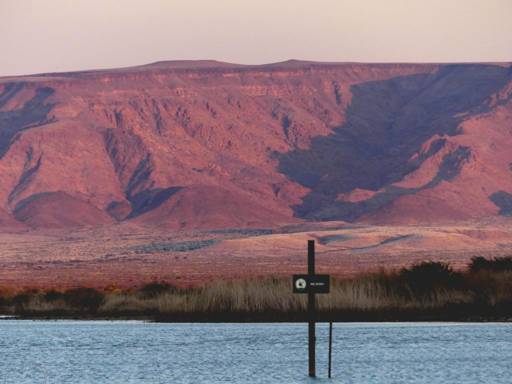 Fündig wurden wir schließlich an einem großen See, dem Naute Reservoir etwas südlich des Abzweiges von B4 nach Keetmaanshop in Richtung des Canyons. Direkt am Seeufer schlugen wir unser Lager auf und nach kurzem Pastasnack zum Abendessen genossen wir den atemberaubenden Sonnenuntergang in Form von einer feuerroten Kulisse der den See umgebenden Berge in der Ferne.