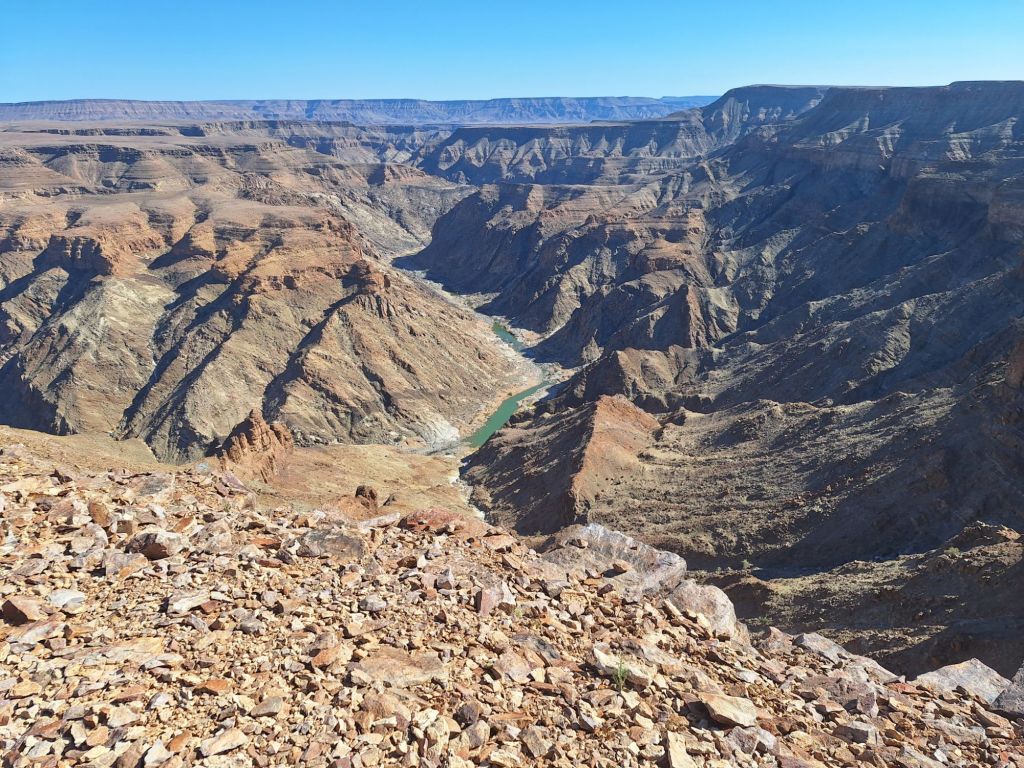 Nach wenigen Kilometern in den Park waren wir am ersten Aussichtspunkt – und der Blick war wiedermal umwerfend. Bei einem kleinen Snack-Frühstück absorbierten wir den weitläufigen Blick über den Canyon mit dem sogar etwas Wasser führenden Fishriver im Tal. Die morgendliche Kühle? Eventuelle Müdigkeit ob des doch straffen Programmes? Alles egal in diesem Moment! Einfach nur Genießen, diese Naturschönheit!