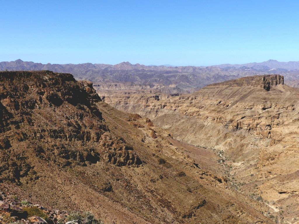 Wieder auf Asphalt ging es dann nachmittags weiter östlich in Richtung der Stadt Keetmaanshop. Die Landschaft war nicht mehr so sensationell wie vorher, aber langweilig wurde es in diesem großartigen Land trotzdem nicht. Nächstes Ziel: Der Fishriver Canyon. Es ist der größte Canyon Afrikas und sogar der zweitgrößte der Welt hinter dem wohl jedem Leser bekannten Grand Canyon in Arizona.