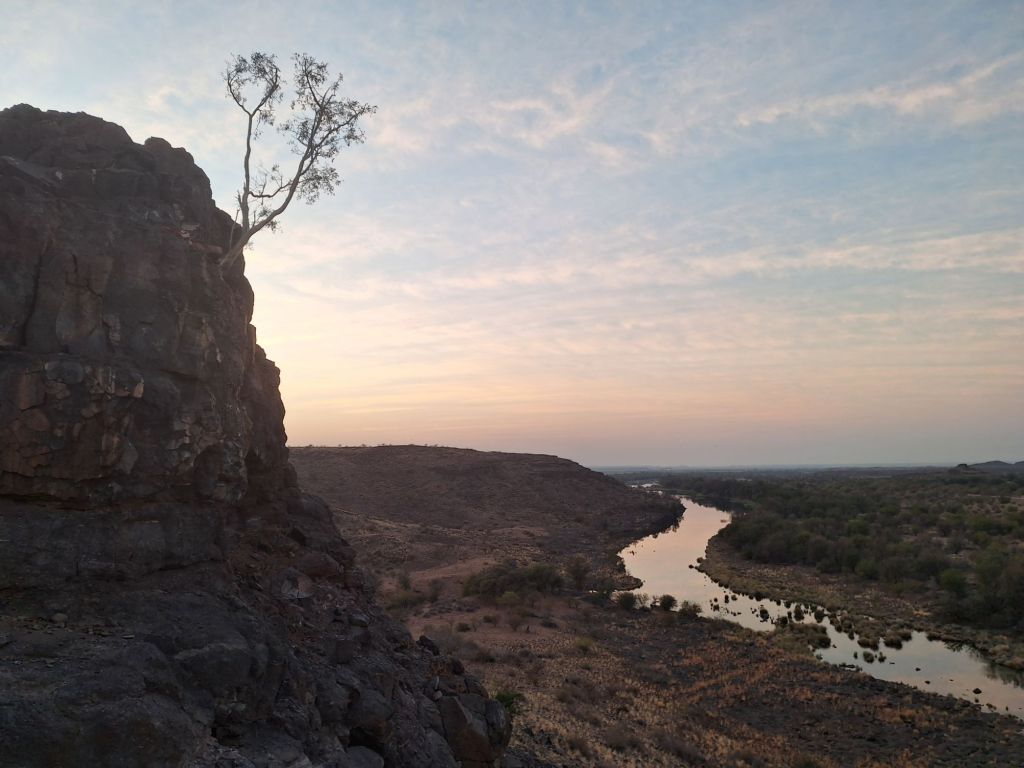 Nachts störte dann auch nichts unsere Ruhe, bevor nun weitere 600 Kilometer bis zum Ethosa-Park warteten. Vor Fahrtantritt genoss ich nach Erklimmen des Felsrückens jedoch noch den umwerfenden Sonnenaufgang mit Blick über den Fishriver. Ein kleiner Moment zum Innehalten.