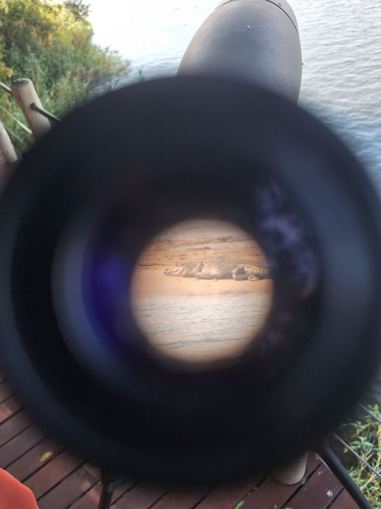 Nach dem finalen Sonnenuntergang ging es wiederum zurück zur Campsite und nach ein paar Snacks rasch wieder schlafen. Für den nächsten Morgen war zumindest ausnahmsweise mal nichts geplant und wir konnten in Ruhe die Zeit genießen und durch das Fernrohr an der Aussichtsterrasse nebenbei noch ein prächtiges Krokodilexemplar auf einer Sandbank des Flusses sichten, welches sich entspannt sonnte. So faul wäre ich auch mal gerne 😉