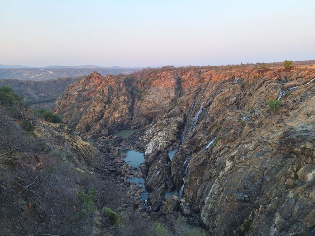 Am nächsten Morgen war dann von den Dreien nur Omar wieder früh auf den Beinen. So ließen wir die zwei Langschläfer in Frieden, schnappten uns das Auto und fuhren zu den Ruacana Wasserfällen hoch. Der Ausblick auf den gut 120 Meter hohen Wasserfall im Morgenlicht (übrigens damit sogar minimal höher als die Victoriafälle) war überwältigend. Minuspunkte gab’s nur dadurch, dass der Wasserfall aufgrund der Trockenzeit nun sehr wenig Wasser führte.
