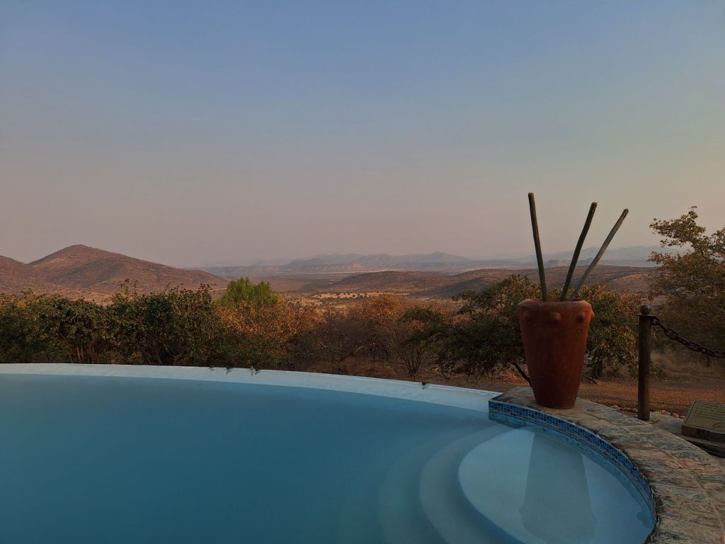 Nachmittags waren wir dann auch schon in Opuwo und nach einem Lebensmitteleinkauf bezogen wir den Campingplatz auf einem Hügel am Fuße des Ortes mit wunderbarem Blick über die weite, offene Landschaft. Im Sonnenuntergang gab’s ein Bad im Infinity Pool der Campsite – wahrlich der Stoff, aus dem Träume gemacht sind…