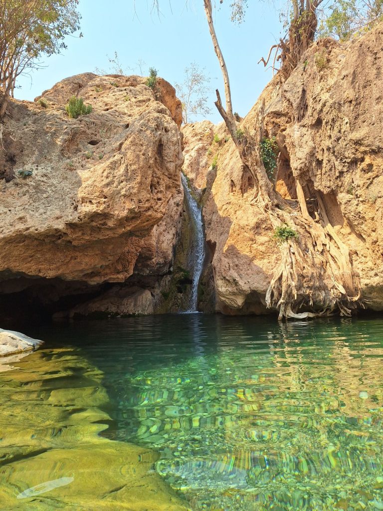 Über Treppen stiegen wir die 120 Höhenmeter hinab zu den Landebecken des Wasserfalls inmitten von Felsformationen. Ich ließ mich nicht lumpen, kletterte über die Felsen und nahm in einem der Becken ein erfrischendes, morgendliches Bad. Dass sich auch hier in den Cascaden Krokodile verstecken könnten, erfuhr ich erst hinterher. Na ja, Hauptsache gesund…