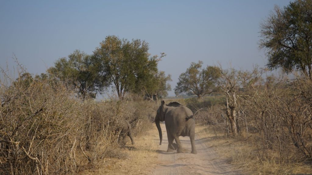 Nach nur etwas kühler, aber nicht zu frischer Nacht waren wir am nächsten Morgen wieder ausgeschlafen und startklar. Nach dem Frühstück wurde der Tag gestartet mit einer Fahrt durch den Mahango-Nationalpark. Und direkt nach wenigen hundert Metern stand uns bereits der Mund offen: Riesige Waldelefanten standen vielleicht 100 Meter entfernt von uns in den Büschen. Sie kamen immer näher und überquerten sogar vor uns die Straße. Meiner Mutter rutschte erst einmal buchstäblich das Herz in die Hose ob der Nähe dieser furchteinflößenden Tiere…