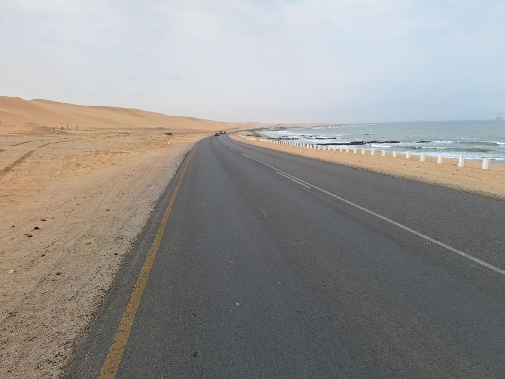 Auf den letzten 10 Kilometern jedoch drehte der Wind und bei ordentlichem Gegenwind kämpfte man sich geradezu in die beschauliche Küstenstadt mit Hafen, übrigens dem einzigen in Namibia. Aufgrund der damit einhergehenden wirtschaftlichen Bedeutung der Stadt war der Verkehr auf dieser Route auch nochmals unangenehm. Aber wir haben es überlebt. Bereits mittags waren wir da und genossen ein wenig die Zeit in der großen Dunes Mall.