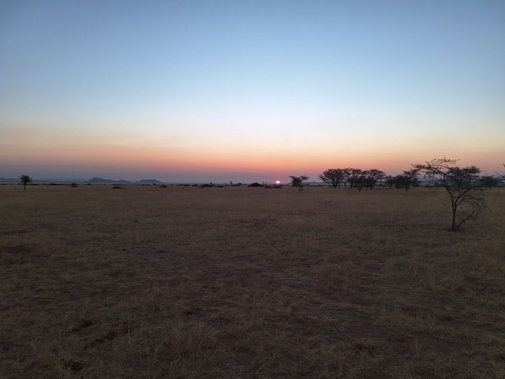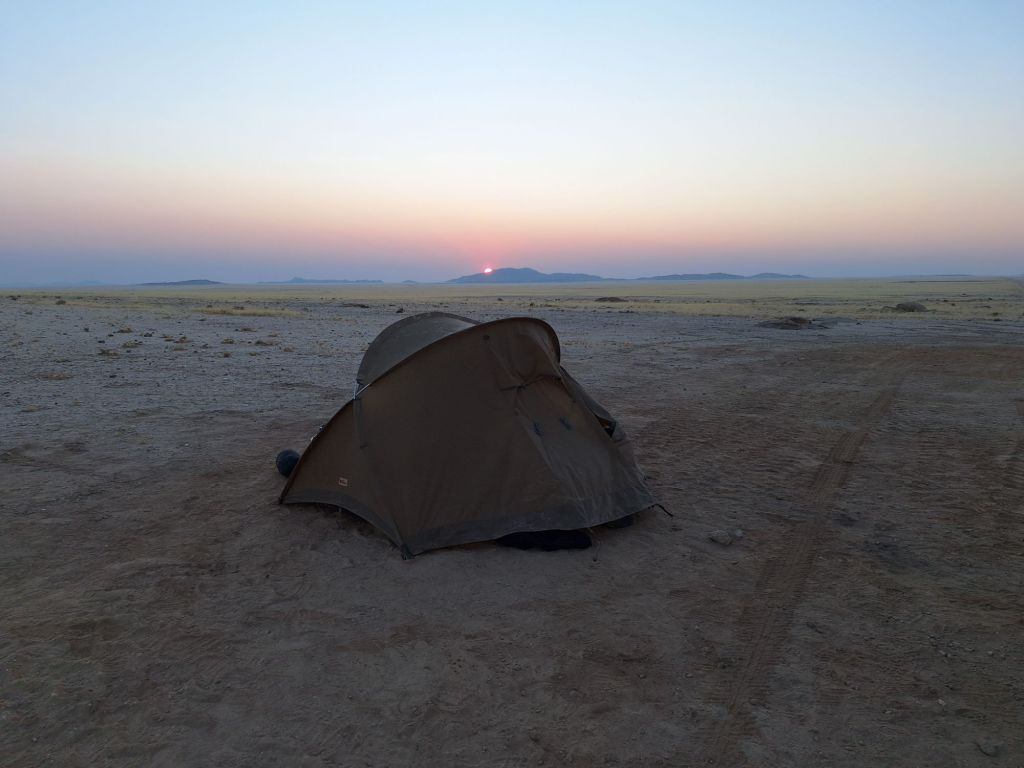 Am frühen Abend kamen weitere, vermeintliche Arbeitskollegen an den Ort des Rangers. Einer war wohl als Bauunternehmer nur auf der Durchreise nach Swakopmund, als ich ihn kennenlernte im Gespräch über meine Fahrradreise. Ein anderer blieb hier über Nacht, schlief in einem der Zelte. Er war super nett. Er bot mir an, am nächsten Morgen Kaffee zu machen, weil ich aktuell kein Gas habe zum Wasser kochen. Zudem durfte ich ohne Probleme am Wassertank im Bauwagen auch meine Wasserflaschen auffüllen. Luxus! Und auch nicht unwichtig, schließlich sind es noch immer 140 Kilometer bis Solitaire, dem nächsten Ort mit etwas Zivilisation…mal schauen, wie die Straßen sind und wie lange man dahin braucht.