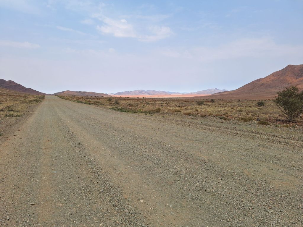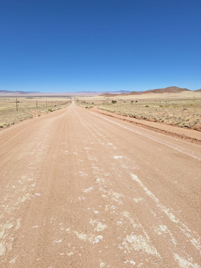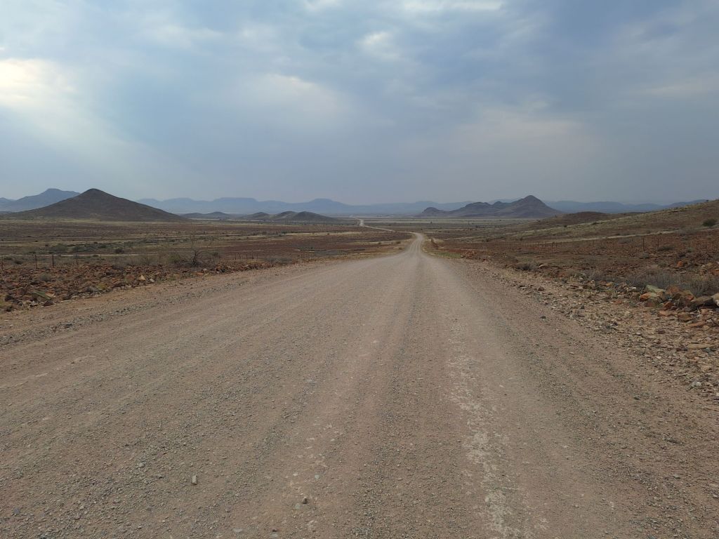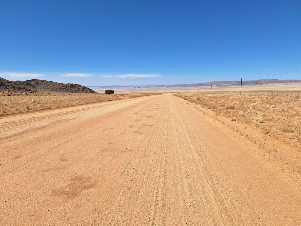 In einem kurzen Gespräch mit Host André vor der Losfahrt erklärte dieser mir, warum die Straßen hier so schlecht sind. Wasser ist in dem Wüstenklima in dieser Gegend einfach ein rares Gut und dementsprechend teuer. Und eben dieses Wasser ist notwendig, um diese Gravelpisten zu präparieren. Die entsprechenden Ressourcen (Fahrzeuge sowie eben Wasser) müssen aus Windhoek als großes Wirtschaftszentrum bereitgestellt werden.
