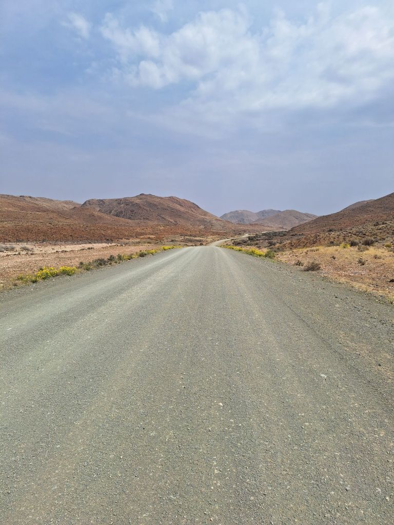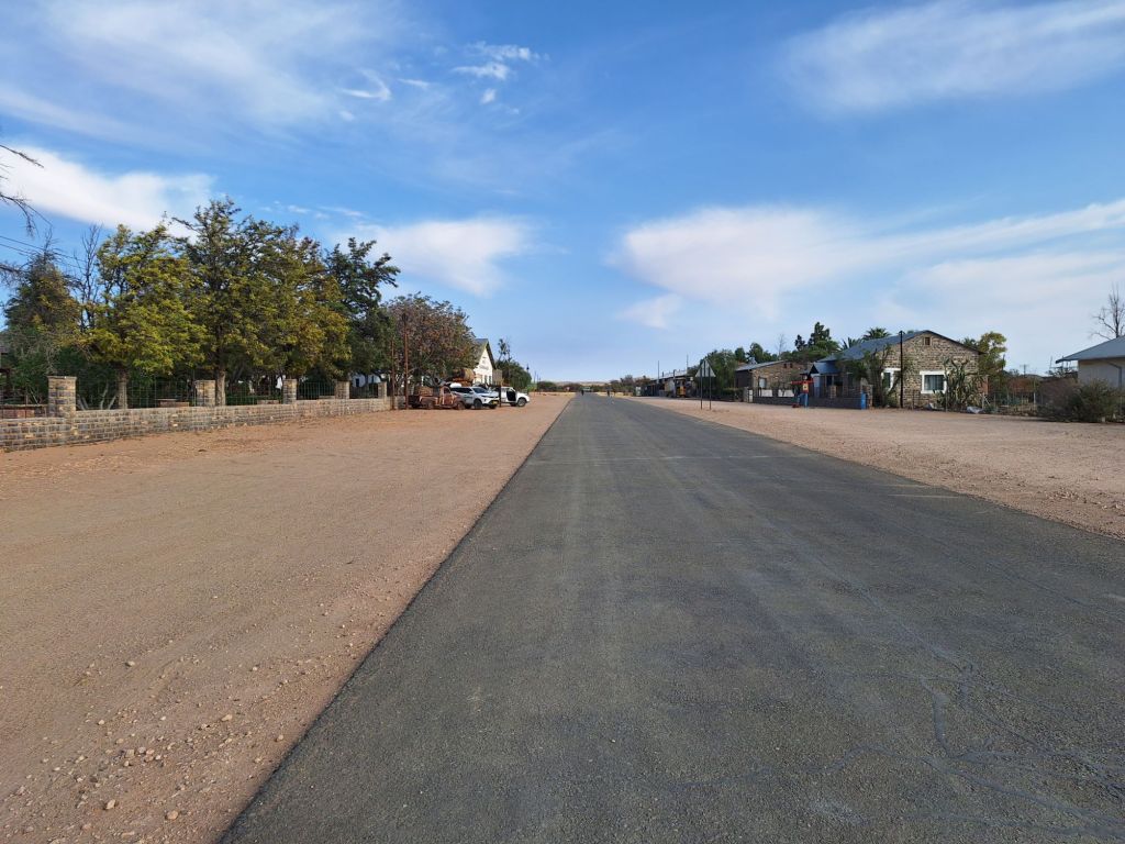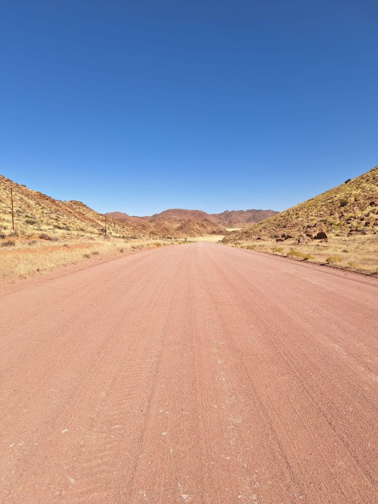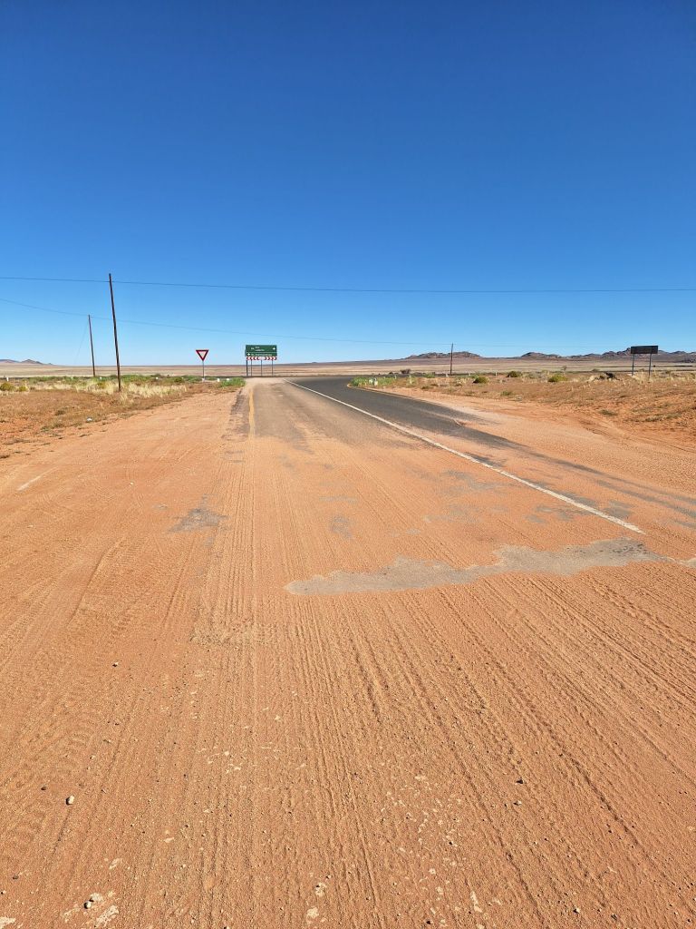 In einem kurzen Gespräch mit Host André vor der Losfahrt erklärte dieser mir, warum die Straßen hier so schlecht sind. Wasser ist in dem Wüstenklima in dieser Gegend einfach ein rares Gut und dementsprechend teuer. Und eben dieses Wasser ist notwendig, um diese Gravelpisten zu präparieren. Die entsprechenden Ressourcen (Fahrzeuge sowie eben Wasser) müssen aus Windhoek als großes Wirtschaftszentrum bereitgestellt werden.