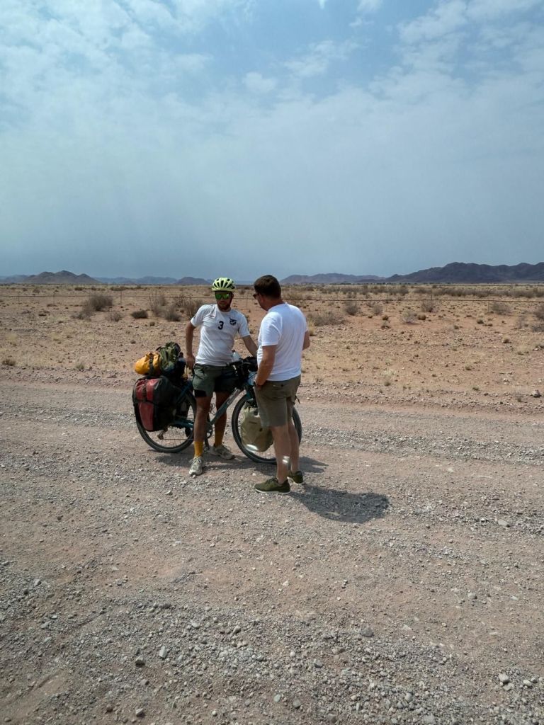 Bald hielt eine neue, deutsche Reisegruppe für mich an: Olli aus Norddeutschland, mit dem ich wiederum super nett ins Gespräch kam. Er war aktuell auf dem Weg in die entgegen gesetzte Richtung: Nach Norden in den Ethosa-Nationalpark. Mir wurde Wassernachschub gegeben und außerdem machten wir noch ein paar gemeinsame Fotos. Wenn es Lichtblicke auf diesen wahrhaft quälenden Strecken gab, dann definitiv die hilfsbereiten und großzügigen Touristen, denen man auf der Straße begegnete. Man zwar zwar alleine unterwegs im absoluten Nirgendwo, ganz alleine war man jedoch nie so wirklich, selbst wenn man tatsächlich aufgrund einer schwerwiegenden Panne „gestrandet“ wäre.