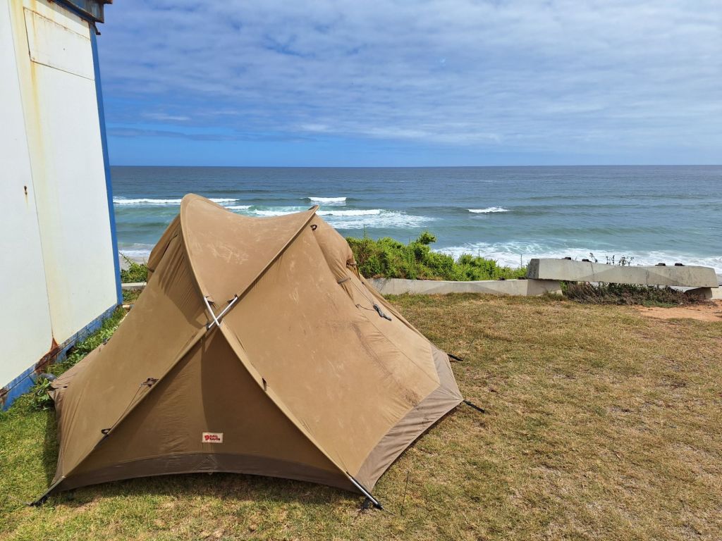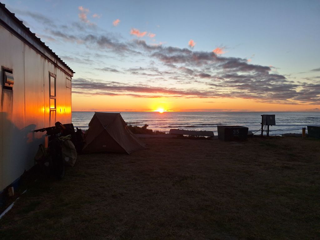 Immerhin: Die Etappen waren kurz und entsprachen so trotz mancher widriger Bedingungen eher einer entspannten Kaffeefahrt. Am späten Vormittag wiederum war der paradiesische Strandort direkt an einer Steilküste erreicht und ich stellte mein Zelt wiederum im Caravanpark in Premium-Lage am Strand auf.