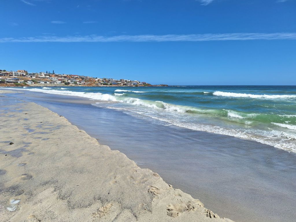 Wieder zeitig am späten Vormittag war nach wieder 80 Kilometern Strandfontein erreicht. Und damit auch das Meer, nach einer kurzen Abfahrt stand ich unten an der Küste – der letzte Meilenstein war erreicht, noch etwas über 300 Kilometer bis zum Kap der guten Hoffnung! Wie passend, dass es hier gleich einen Platz zum Aufstellen des Zeltes gab in bester Premiumlage am Meer.