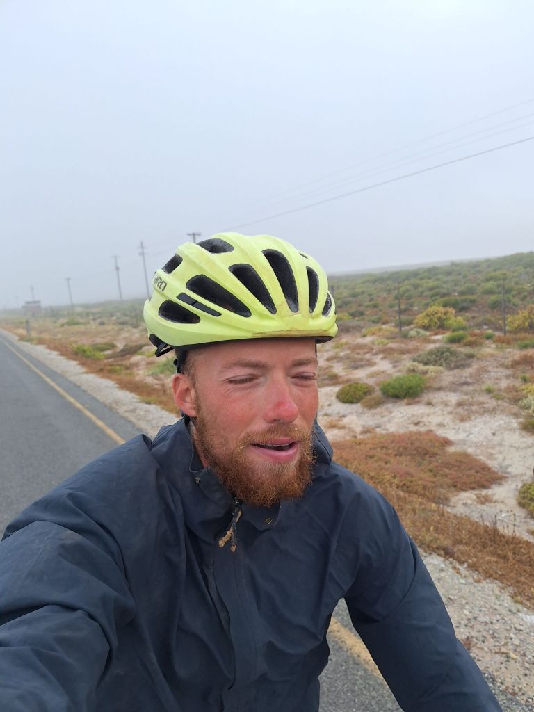 Aber nicht temperaturtechnisch: Im Zelt war nachts wiedermal ein Pullover im Schlafsack obligatorisch. In der Früh weckte mich am nächsten Tag ein nasskalter Küstennebel. Ohne Zeitstress ließ ich es entspannt angehen und frühstückte noch in einem kleinen Café im Ortszentrum. Der Nebel ließ sich jedoch Zeit, weshalb ich auf den ersten Asphaltkilometern nochmals ordentlich in meiner Windjacke strampeln musste, damit man überhaupt warm wird. Es war das Feeling eines nasskalten Novembertages in der Heimat – die Akklimatiserung an die Rückkehr Ende Oktober beginnt bereits hier in Südafrika.