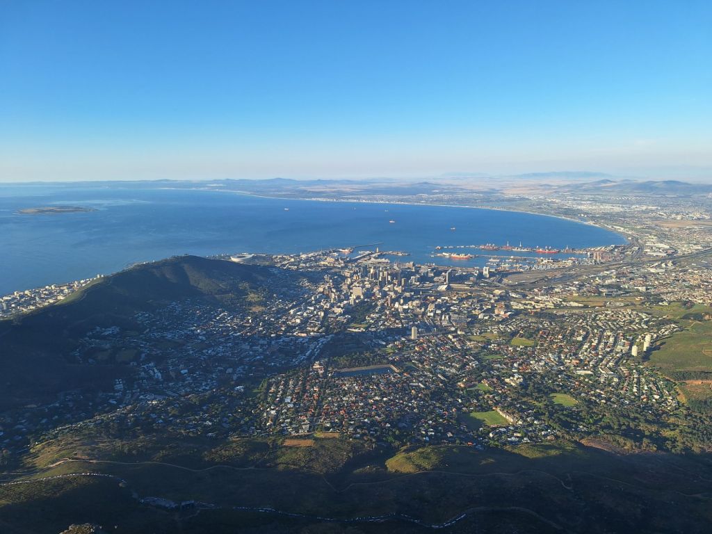 Oben herrschten perfekte Bedingungen vor: Hier, wo normal der Wind pfeift, war absolut Flaute. Und selbst auf über 1.000 Metern Höhe war die Hitze spürbar. Ein Hochsommertag mitten im südafrikanischen Frühling. Die Jacke wurde umsonst mitgeschleppt. Bei einem kühlen Drink erholten wir uns vom Aufstieg und klapperten anschließend im Frühabendlicht noch den ein oder anderen umwerfenden Aussichtspunkt auf die Stadt und die anschließende Bucht ab.