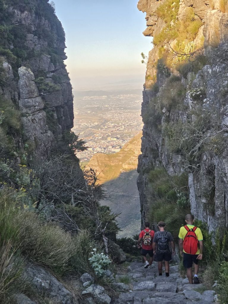 Es gibt viele Routen auf das Plateau. Die einfachste ist ein steiler Wandertrail, genannt „Gorges Trail“, da sie über eine Schlucht nach oben führt. Als wohl schönste und spannendste Route wird die über das „India Venster“ direkt neben der Seilbahn beschrieben. Zugleich soll sie aber auch die schwerste und anspruchsvollste Option sein. Unerfahrenen Nicht-Alpinisten wird dringend davon abgeraten. Nach langem Austausch konnte ich meine abenteuerlichen Mitstreiter davon überzeugen, dass wir es uns ja anschauen und gegebenenfalls umkehren können.