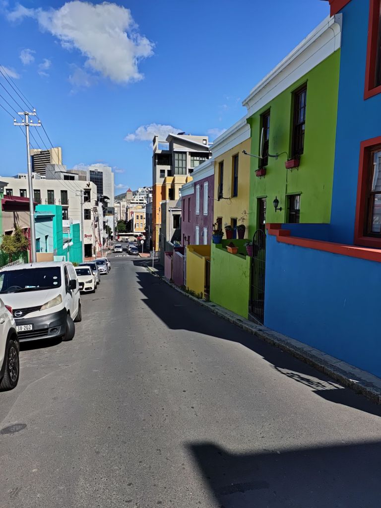 Bevor man sich zu sehr in Gedankenspiele verstrickte, gingen wir nochmals los! Bitte nicht vergessen, nochmal den Moment zu genießen und die letzten Eindrücke von Kapstadt aufzusaugen! Hierzu bot sich ein Spaziergang in das Bo-Kaap-Viertel mit seinen bunten Häusern an. Die Häuser dieser Siedlung sind fast komplett erhalten im Vergleich zu früheren Zeiten und tragen so den Fußabdruck und die Bauweise früherer Kolonialzeiten vor ca. 300 Jahren, als freigelassene Sklaven sich in genau diesem Viertel mit seinen steilen Gassen niederließen.
