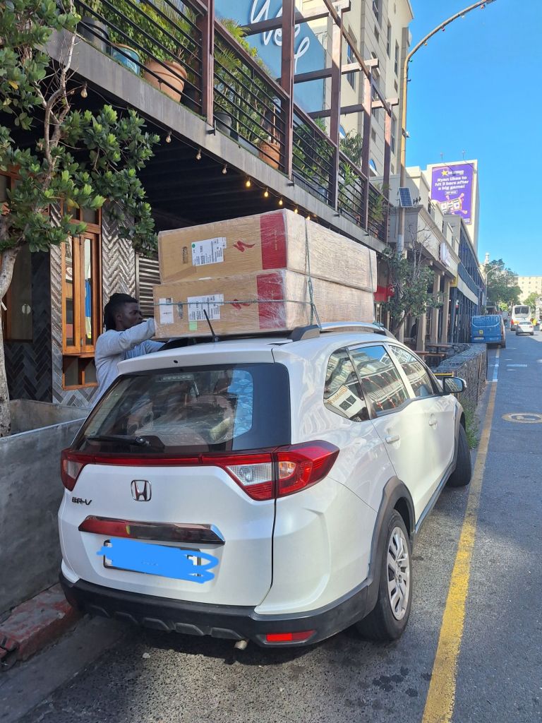 Wir fuhren los und hatten zudem mit der Tageszeit viel Glück. In die entgegengesetzte Richtung (ins Zentrum von Kapstadt) machte sich aufgrund des morgendlichen Berufsverkehrs ein markanter Stau bemerkbar, während wir ohne Zeitverlust gen Flughafen rollten. 15 Kilometer später waren wir am Ziel und die Konstruktion hat gottseidank gehalten. Leidglich die Folie um meinen Karton musste aufgrund des Fahrtwindes wohl stark leiden. Sie hing nur noch halb und relativ lose am Karton.