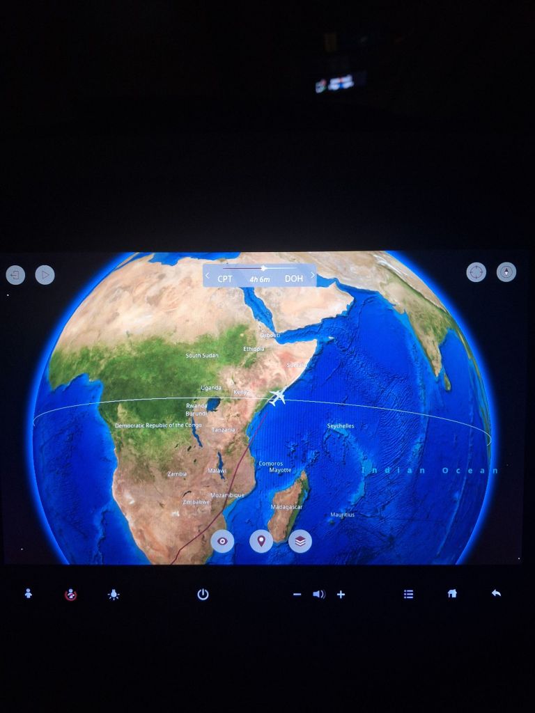 Abgesehen von den vorzüglichen Mahlzeiten bei Qatar Airways verbrachte ich nun meine Zeit damit, auf dem Bildschirm vor mir nachzuverfolgen, wo wir gerade drüber fliegen: Erst Südafrika, dann Mosambik, dann Tansania, dann bei Kenia. Quasi die „Ostroute“ nun per Flieger wieder nordwärts. Ob es irgendwann eine Fortsetzung geben wird?! Wer weiß, was das Leben bringt…